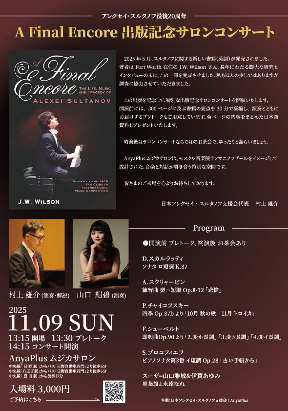 もちろん、コンサートとしても、この本の出版を意識して、そしてスルタノフ没後20年であるメモリアルイヤーであることも意識して、意味のあるスタイルでやっていきます。山口紺碧さんのソロが中心ですが、一部イベントを記念した連弾などもございます。